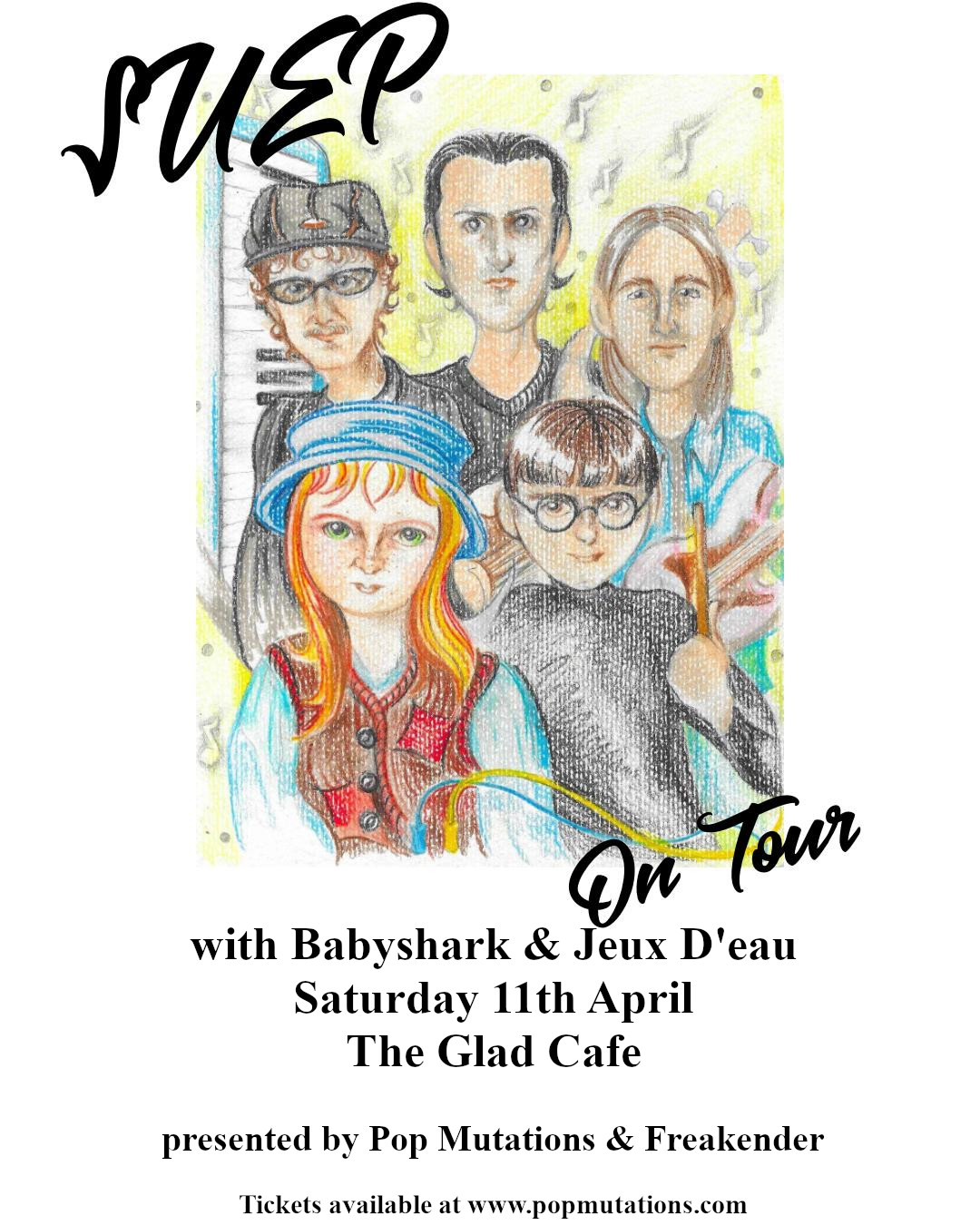 Pop Mutations & Freakender present: SUEP + Babyshark + Jeux D'eau Saturday 11th April The Glad Cafe 18+ Led by Georgie Stott and Joshua Harvey, SUEP have become fixtures of south-east London’s underground through a series of shared living spaces, improvised studios and DIY venu