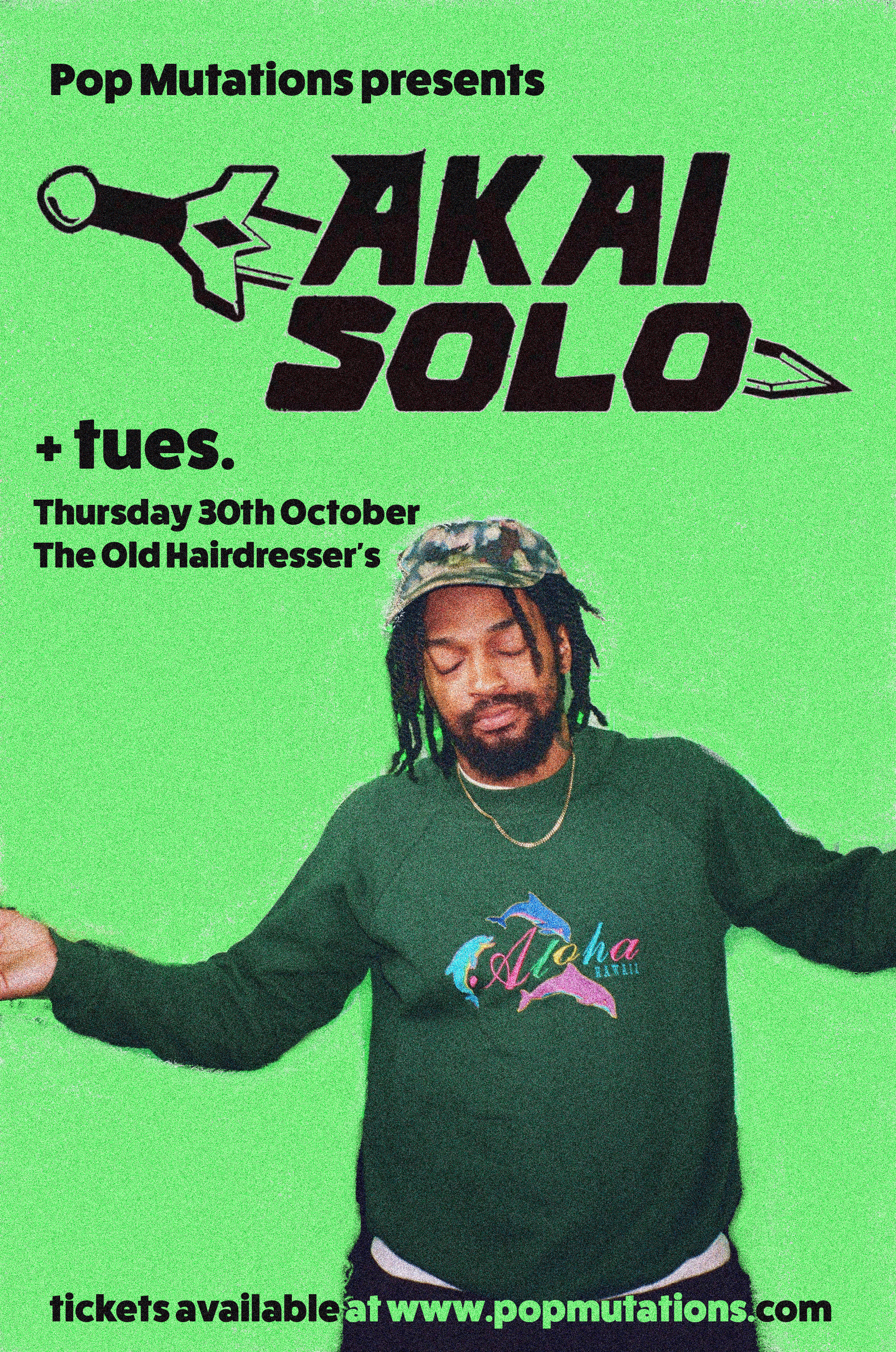 Pop Mutations presents: AKAI SOLO + Special Guests Thursday 30th October The Old Hairdresser's 18+ NYC trailblazer AKAI SOLO has been known for his relentless output since 2018. Notable releases include but are not limited to Black Sand with Pink Siifu, Mad Space with fellow Tas