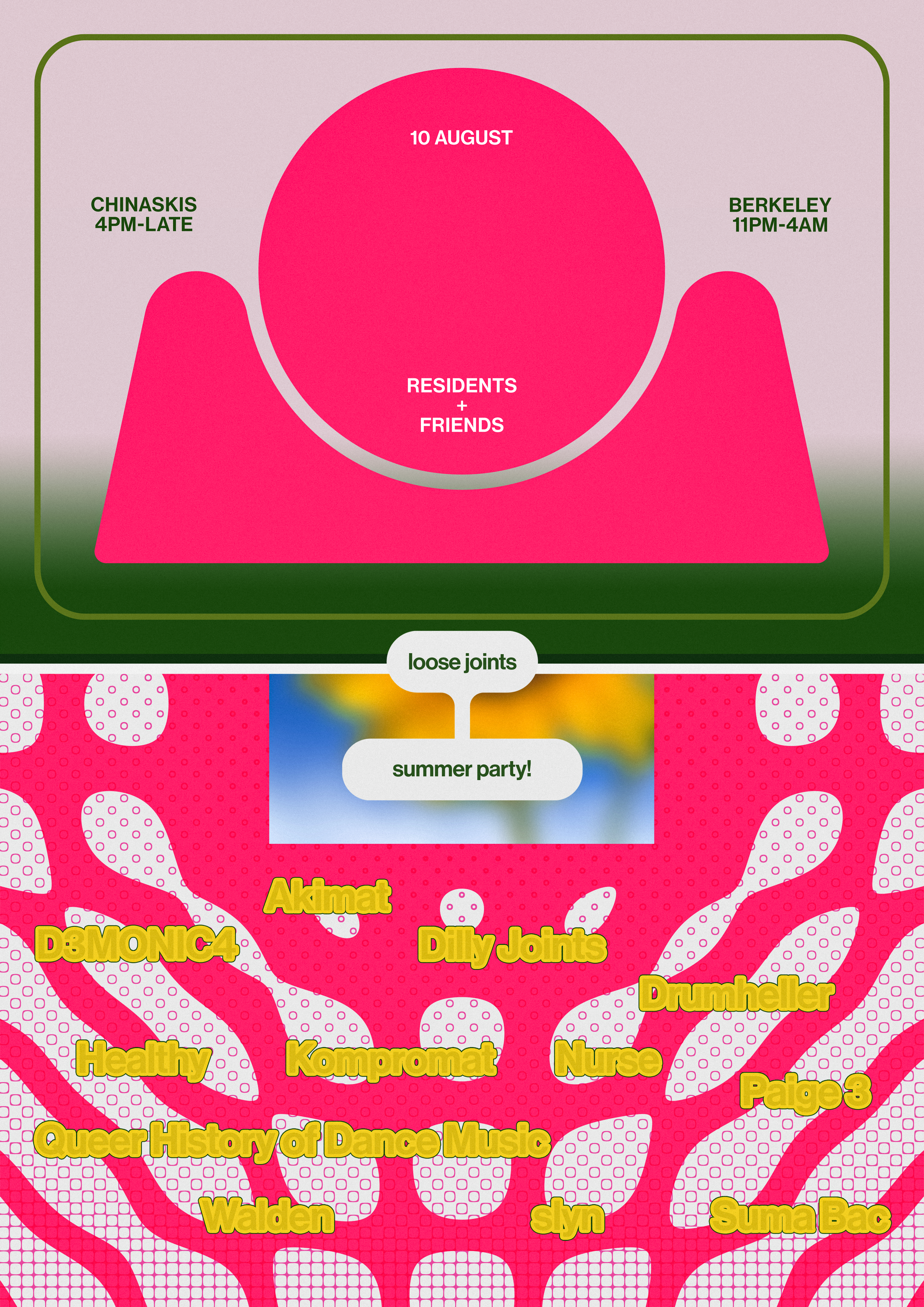 LOOSE JOINTS SUMMER PARTY - DAY & NIGHT North Street is the place to be on Sat 10th August - bring sun cream/umbrellas as appropriate. From 4pm, we'll be taking over Chinaskis then onto the Berkeley Suite. Chinaskis is free Berkeley Suite is free before midnight then £8