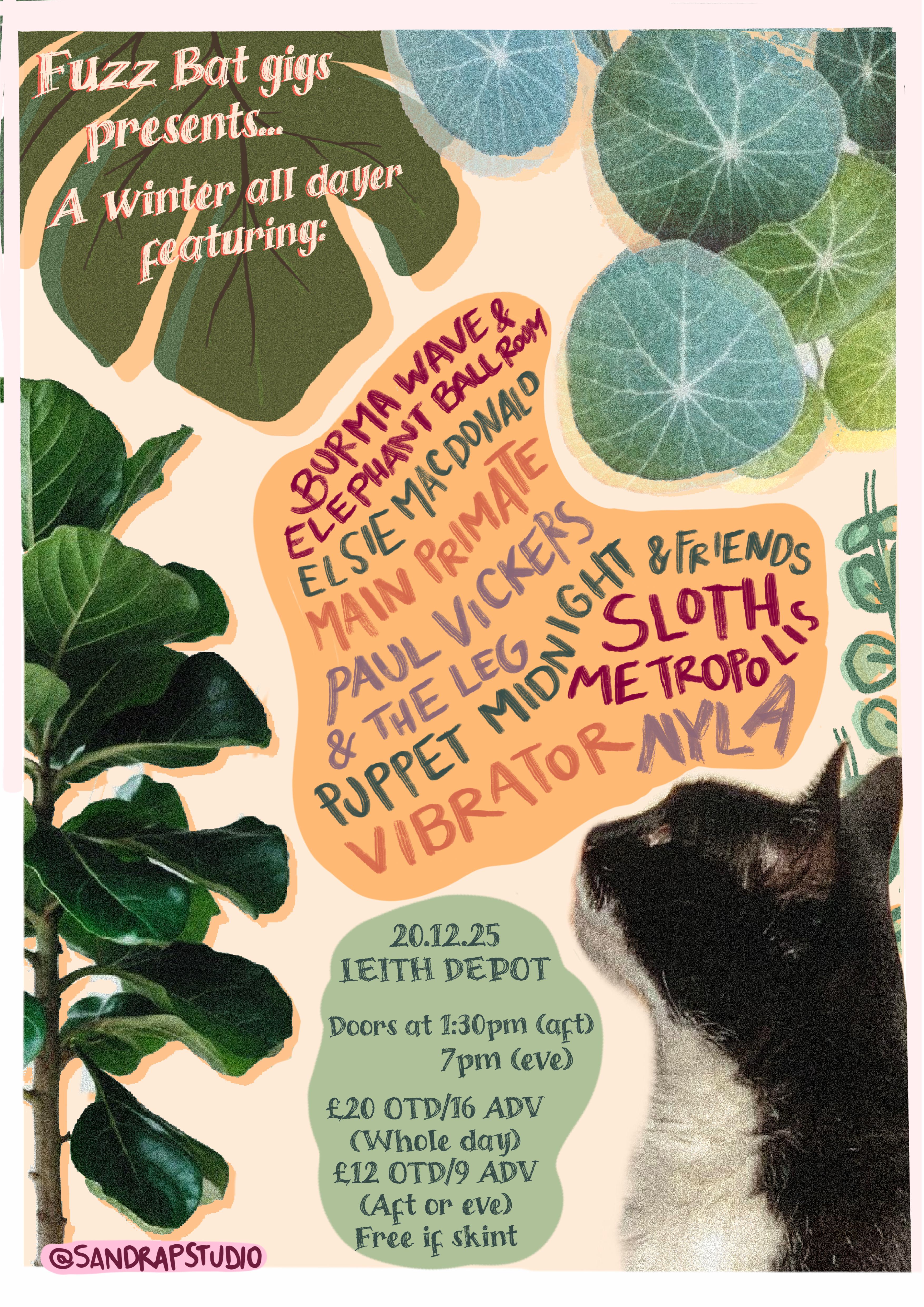 A winter all dayer featuring a varied lineup at Leith Depot. Final Fuzz Bat show of the year. Whole day-£16 ADV/£20 OTD Aft or Eve-£9 ADV/£12 OTD Doors at 1:30pm (aft) and 7pm (eve) Poster by Sandra Philippakis