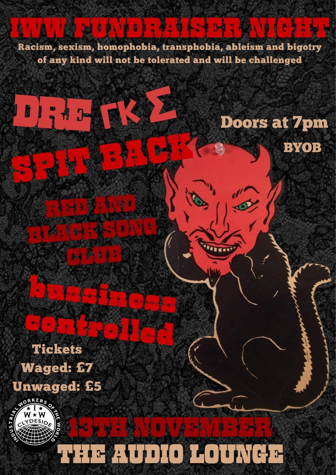 IWW (Industrial Workers of the World) Fundraiser Night Join us for an evening of music and noise to help raise funds for the local IWW Branch in Glasgow. Note: Racism, sexism, homophobia, transphobia, ableism and bigotry of any kind will not be tolerated and will be challenged