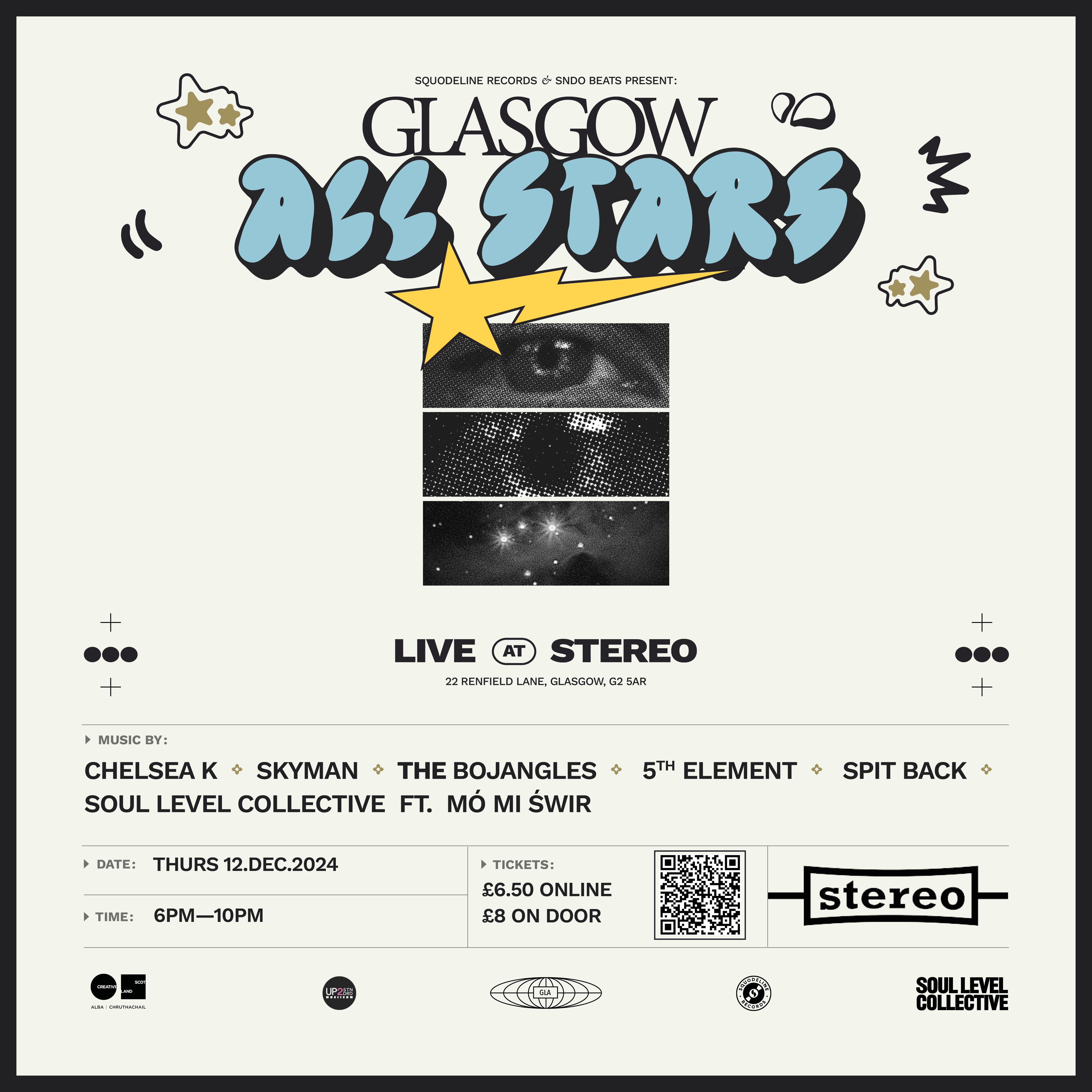 Glasgow All Stars A night showcasing Glasgow's varying musical talent featuring six acts with unique sounds and stage presence, making it personal and memorable. We will see you all in stereo supporting our local bands and artists. £6.50 Online / £8 On door
