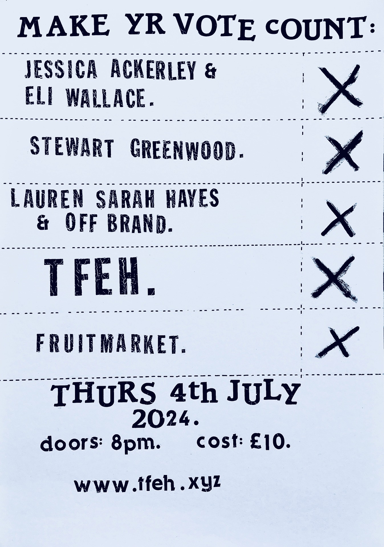 At TFEH's Polling Day experimental music special, all the candidates are trustworthy and you dinnae have to choose just one. Fruitmarket is fully accessible, with an elevator for those who require it. £10 entry, but let us ken if yr skint & we'll make it happen for you.