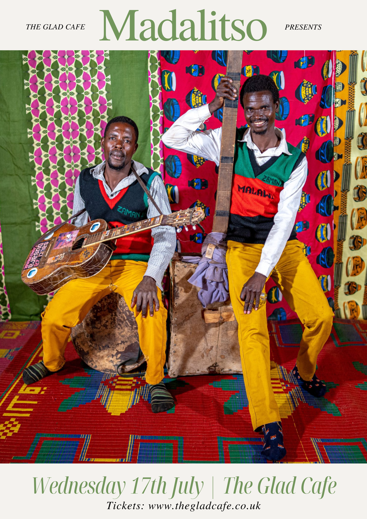 Madalitso The Glad Cafe £12adv / £14 otd (NOTAFLOF) -- Madalitso band are a two man musical army from Malawi. Described as 'Uplifting and Vibrant' by the BBC, they get crowds beaming with wonder and on their feet dancing every time. Their first album was produced by Bongo Joe rec