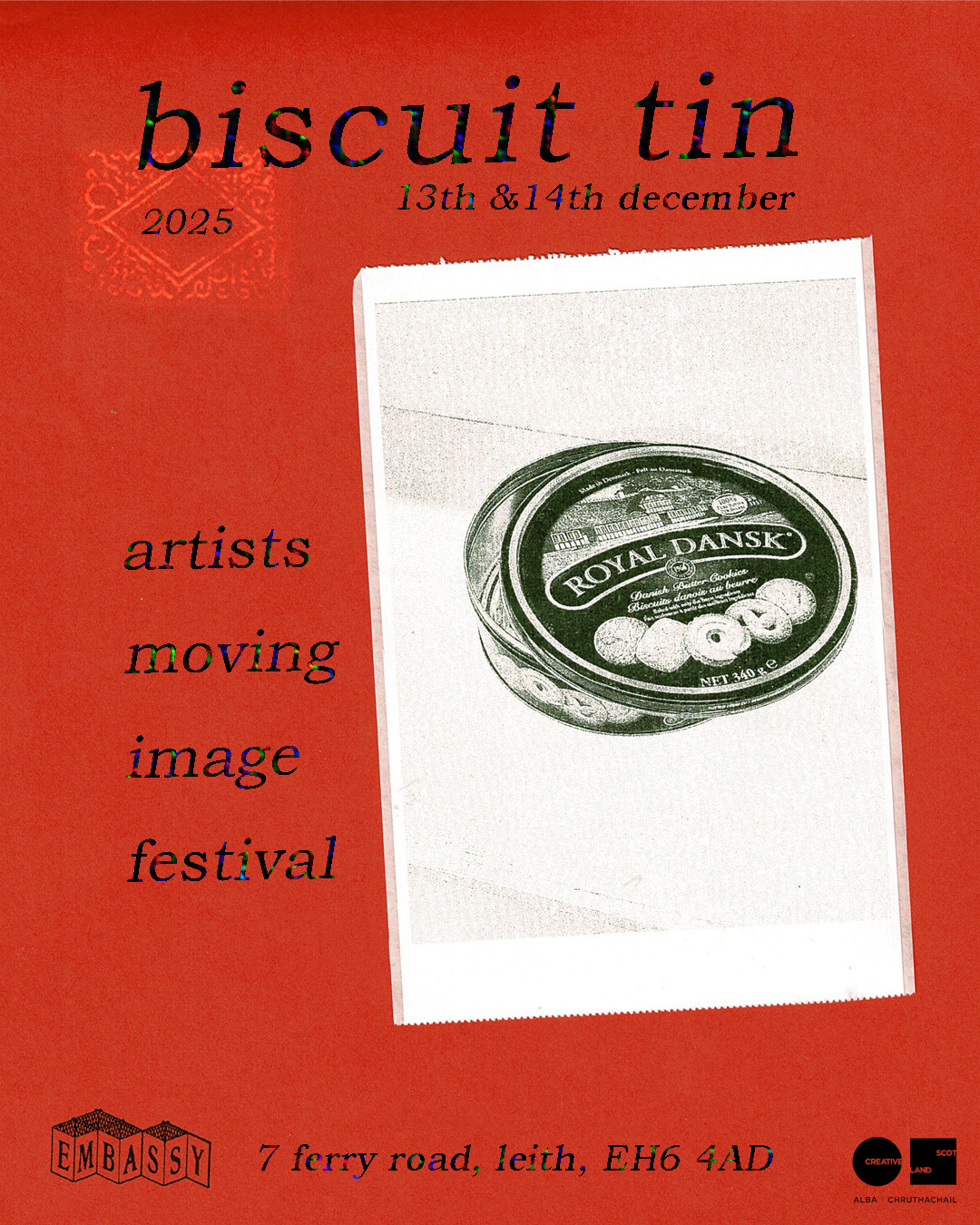 Biscuit Tin is back to bless your eyes, ears and minds with some of the finest moving image works from Scotland and beyond! EMBASSY Gallery will be presenting a showcase of artist’s films selected from our open call. Join us for the premiere on Saturday 13th December 7-9pm. Free