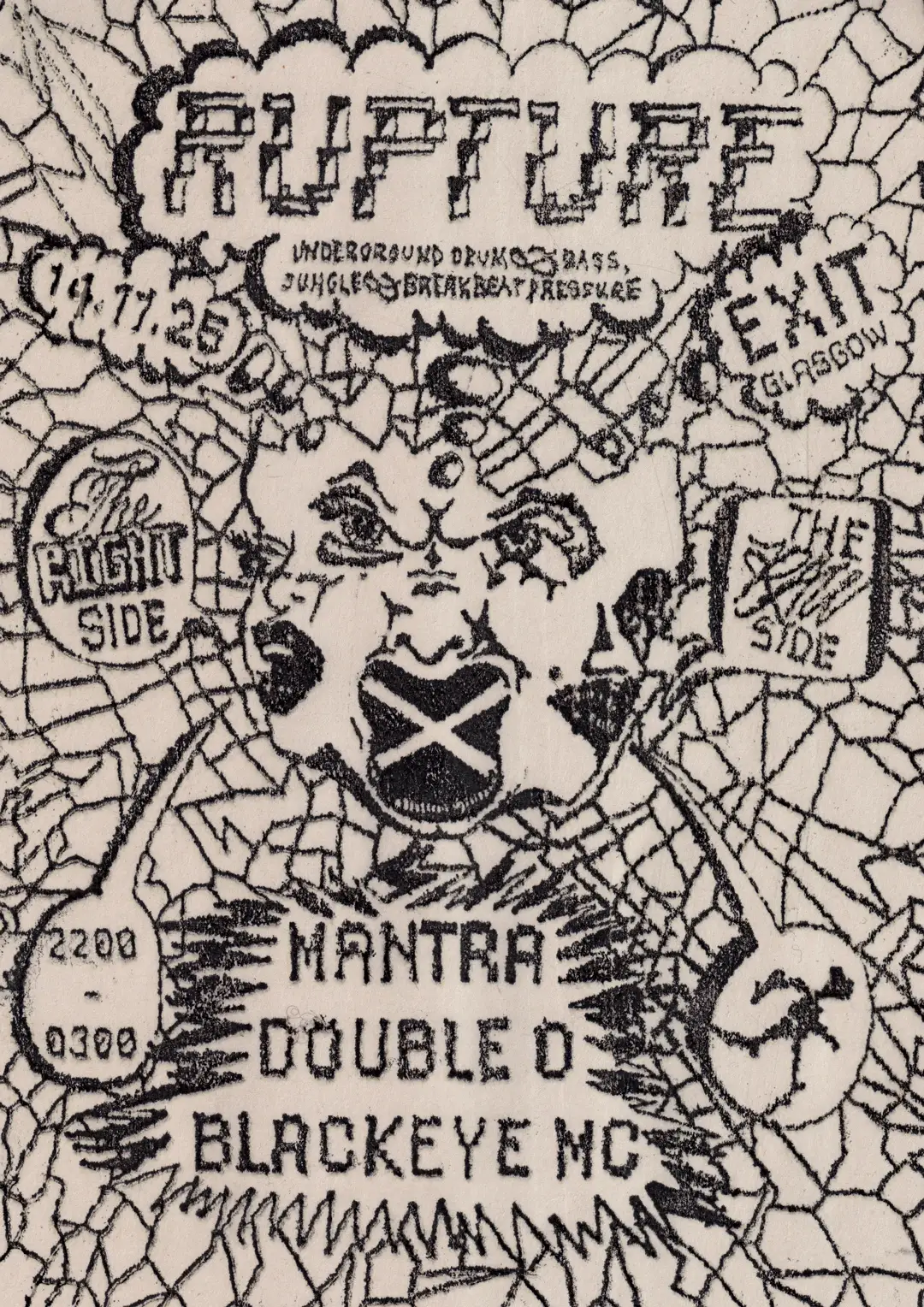 Underground Drum & Bass, Jungle, and Breakbeat pressure. Mantra Double O Blackeye MC With regular outings to some of the UK’s best undergound spots, the Rupture crew trek north across the border once again to their new Scottish and Glasgow home EXIT