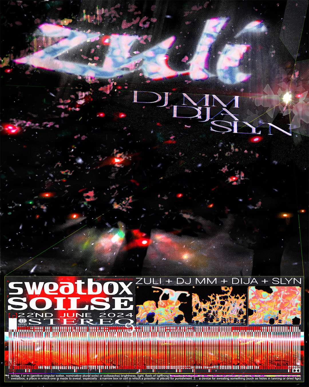 SweatBox x Soilse x Stereo: ZULI Stereo join forces with SweatBox & Soilse to bring Cairo bass experimentalist ZULI (irsh) to the club for a Scotland performance with local force on support in MM (Async Figure), DIJA (TAQA) & slyn (Subcity) • £8-13.80 (Community tix avail)